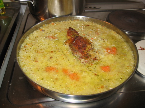 Najpre skuvam na laganoj vatri piletinu sa mesavinom povrca , sargarepa, zelen, paskanac... najpre kuvam u malo vode a onda kada je skoro kuvano nalijem punu serpu. Kada provri sklonim sa vatre. U dublju tavu na ulju stavim da se izdinsta staklasto 1-2 glavice sitno iseckanog crnog luka. 200 g pirinca operem mlakom vodom i ubasim u staklasto uprzen luk. Promesam 1-3 minuta tako a onda nalijem malo tecnosti da pirinac pocne da bubri. Tecnost jos koji put dodam ukoliko pirinac brzo upija pa da se ne zalepi za posudu.