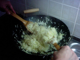 Jednu glavicu crnog luka i dva cena belog luka sitno iseckati i propziti u voku, dodati 1 kasikicu djumbira u prahu, i u to dodati belo pilece meso ( u originalu idu i racici-skampici) iseckano na kockice i isto brzo proprziti u voku na jakoj vatri da ispari sva tecnost. pobiberiti, malo soli,malo karija, dodati persunovog lista i to pomesati sa kupusom.