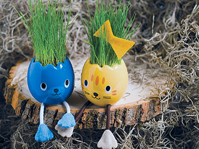 Na prvoj su polutke jaja i u njima posađena pšenica, a nožice su napravljene. Mogu se praviti od onih ukrasnih tračica kupljenih u pozamanteriji, a stopice od nekog kartončića u boji. Meni su se mnogo dopali.