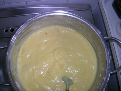 umeshate shecher zzumanca i brasno, u to sipate malo onog vrelog mleka, razmutite k'o puding, vratite u sherpu s mlekom, blago promeshate i vratite na vatru da pusti kljuch. lagano meshajte da se brashno ne izdvoji i ne treba dugo da kuva.