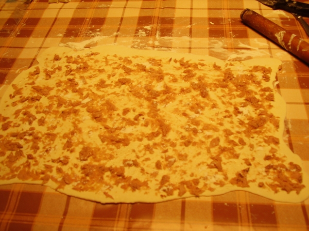 ½ lisnatog testa tanko razvući i premazati je tunjevinom iz jedne knzerve.