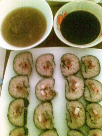 Uglavnom, evo kako je to na kraju izgeldalo - tamnije je sos za sushi, svetlije je miso supa.... a rolatici su prepoznatljivi