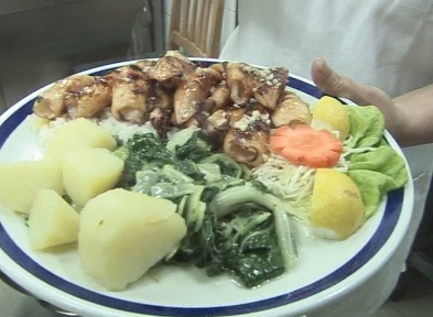 Now we will fry them. We put them on a very hot griddle… and the squid is done. Accompaniments are chard, boiled potatoes and rice…Pour over garlic and olive oil dressing.