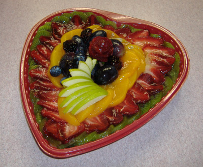 Mešano voće. Nastojte da ga proberete tako da se boje lepo uklope i ne ponavljaju previše. Neko voće efektnije deluje kada je celo (sitne bobice i sl.) dok je neko lepše isečeno na fine komade. Takođe, agrumima (pomorandža, grepfrut, mandarina i sl. ) bi trebalo oguliti opnu oko kriški.