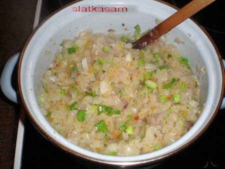 Za to vreme na ulju izdinstatii crni luk i praziluk, pa dodati pirinac, so i alevu papriku i jos malo proprziti.